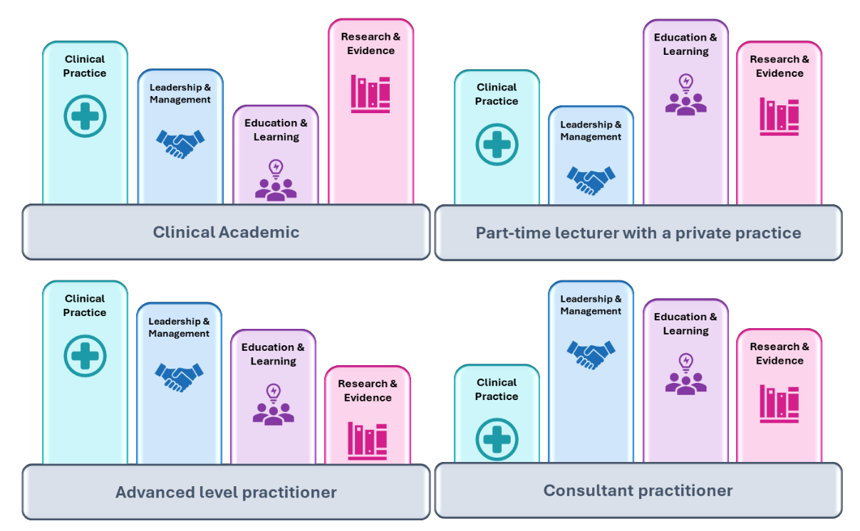 The ‘size’ of each pillar will vary according to your individual scope of practice and role(s). The pillars may go up or down as a proportion of your work-based activities depending on the nature of your career progression if, for example, you change roles, as shown in the illustrative examples.